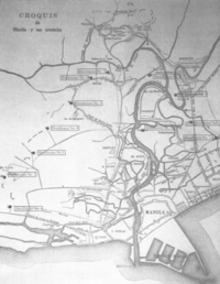 After the surrender of Manila to American forces by the Spanish in 1898, General Aguinaldo demanded occupation of a line of blockhouses on the Zapote Line, which had been the Spanish defensive perimeter. General Otis initially refused this, but later said that he would not object unless overruled by higher authority.[3] It was estimated at the time that there were about 20,000 Filipino troops surrounding Manila, with their distribution and exact composition only partially known.[4]