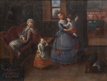 Colonial-era casta painting from 1799, according to which the offspring of a Spaniard and a castiza are deemed to be "Spanish", i.e., White Latin Americans (criollos)