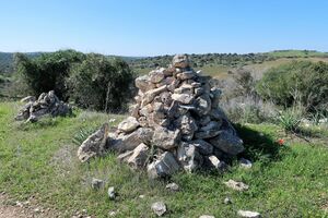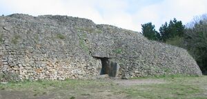 The building of cairns for various purposes goes back into prehistory in Eurasia, ranging in size from small rock sculptures to substantial human-made hills of stone (some built on top of larger, natural hills).[2] The latter are often relatively massive Bronze Age or earlier structures which, like kistvaens and dolmens, frequently contain burials; they are comparable to tumuli (kurgans), but of stone construction instead of earthworks.[3] Cairn originally could more broadly refer to various types of hills and natural stone piles, but today is used exclusively of artificial ones.