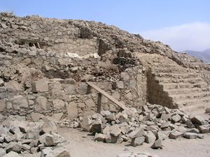 The degree of centralized authority is difficult to ascertain, but architectural construction patterns are indicative, at least in certain places at certain times, of an elite population who wielded considerable power: while some of the monumental architecture was constructed incrementally, other buildings, such as the two main platform mounds at Caral,[7] appear to have been constructed in one or two intense construction phases.[12] As further evidence of centralized control, Haas points to remains of large stone warehouses found at Upaca, on the Pativilca, as emblematic of authorities able to control vital resources such as cotton.[13]