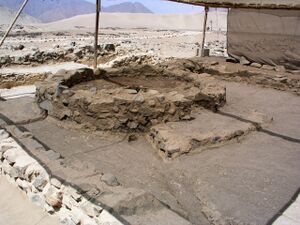 Numerous architectural features found among the settlements of Supe, including subterranean circular courts, stepped pyramids and sequential platforms, as well as material remains and their cultural implications, excavated at Aspero and the valley sites we are digging (Caral, Chupacigarro, Lurihuasi, Miraya), are shared with other settlements of the area that participated in what is known as the Kotosh Religious Tradition. Most specific among these features include rooms with benches and hearths with subterranean ventilation ducts, wall niches, biconvex beads, and musical flutes.[18]قالب:Long quote