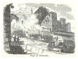 In 155 BC, a raid into Hispania Ulterior (Farther Spain) by the Lusitani and the defeat of two successive Roman praetors encouraged the town of Segeda in Hispania Citerior (Nearer Spain) to rebel. The following year, it refused to pay tribute or provide a military contingent to Rome but formed instead a confederacy with neighboring towns and began the construction of a defensive wall. Quintus Fulvius Nobilior was sent against the Celtiberians in 153 BC, with nearly 30,000 men. But the consul was late in arriving and ambushed soon after, with 6,000 Romans slain. A siege of Numantia several days later, where the Segedans had taken refuge, was no more successful. Three elephants were brought up against the town walls but became frightened and turned on the Romans, who retreated in confusion. There were other setbacks, and the hapless Nobilior was obliged to withdraw to camp, where more men suffered frostbite and died of the winter cold. Nobilior lost over 10,000 men in his campaign.[13] In 137 BC, the Celtiberians forced the surrender of a 20,000-man Roman consular army led by Gaius Hostilius Mancinus.[14] In 134 BC, the consul Scipio Aemilianus took charge of the demoralized Roman troops in Spain and laid siege to Numantia.
