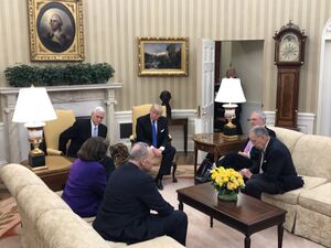 في مايو، بعد أن دعا البيت الأبيض اثنين من الجمهوريين دون أي ديمقراطيين لحضور إحاطة من مسؤولي وزارة العدل بشأن مخبر مكتب التحقيقات الفدرالي الذي أجرى اتصالات مع حملة ترمپ،[74] أرسل شومر وزعيمة الأقلية في مجلس النواب [[نانسي پلوسيرسالة إلى نائب المدعي العام رود روزنشتاين ومدير مكتب التحقيقات الفدرالي كريستوفر راي يدعوان فيها إلى "إحاطة مجموعة الثمانية من الحزبين والتي تتضمن قيادة الكونگرس من كلا المجلسين".[75]