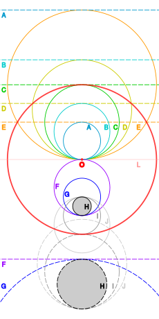 Examples of inversion of circles A to J with respect to the red circle at O. Circles A to F, which pass through O, map to straight lines. Circles G to J, which do not, map to other circles. The reference circle and line L map to themselves. Circles intersect their inverses, if any, on the reference circle. In the SVG file, click or hover over a circle to highlight it.