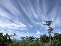 The average cirrus cloud altitude increases as latitude decreases, but the altitude is always capped by the tropopause.[20] These conditions commonly occur at the leading edge of a warm front.[21] Because absolute humidity is low at such high altitudes, this genus tends to be fairly transparent.[22] Cirrus clouds can also form inside fallstreak holes (also called "cavum").[23]