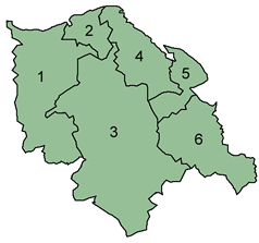 For second-tier local government purposes, Clwyd was divided into six districts: Alyn and Deeside, Colwyn, Delyn, Glyndŵr, Rhuddlan and Wrexham Maelor, each being operated by a district or borough council.[23] These were abolished, along with the county itself, on 1 April 1996.[25] Clwyd County Council's coat of arms was granted in December 1974. The design of the shield, crest and motto includes elements taken from the arms of the former councils of Flintshire and Denbighshire. The green and white wave represents the Vale of Clwyd and the Clwydian Range lying between the two parts. The cross and choughs come from Flintshire's shield, which itself incorporated the traditional arms of Edwin of Tegeingl, while the black lion of the Princes of Powys Fadog is taken from Denbighshire's shield. The motto, Tarian Cyfiawnder Duw can be translated as "The shield of Justice is God".[26]