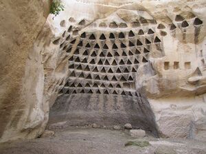 In the Beit Guvrin area several series of large caves dug into soft rock were found. There were several theories about their original use, for ritual burial, for growing pigeons to be used for ritual sacrifice, or for raising pigeons for fertilizer production. One such cave had been covered by an earthquake close to the time of its original usage and had no signs of secondary usage; neither ashes nor pigeon droppings were found in it.[4][5]