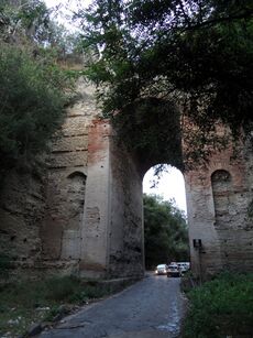 The Arco Felice was a 20 m high monumental entrance to the city built in a cut through Monte Grillo which Domitian made in 95 AD to avoid the long detour imposed by the via Appia, and allow easier access to Cumae along what was later called the via Domitiana while the bridge also carried a road along the ridge of the hill. It was built of brick and tiled in marble, and surmounted by two rows of arches of lighter concrete covered with brick. The piers had three niches on both sides where statues were placed.