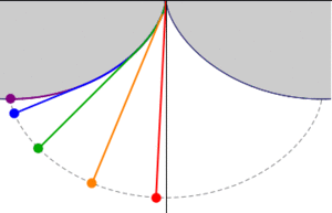 • The tip of an inextensible wire initially stretched on half arc of lower cycloid and bounded to the upper circle in P1 will then follow the point along its path without changing its length because the speed of the tip is at each moment orthogonal to the wire (no stretching or compression). The wire will be at the same time tangent in P2 to the lower arc because the tension and the demonstrated items. If it would not be tangent then there would be a discontinuity in P2 and consequently there would be unbalanced tension forces.