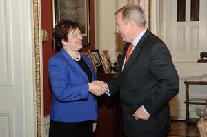 When Majority Leader Harry Reid faced a difficult reelection fight in 2010, some pundits predicted a possibly heated fight to succeed him between Durbin and Senator Chuck Schumer, who is well known for his fund-raising prowess.[23] Reid's reelection rendered such speculation moot. Upon Reid's retirement announcement in 2015, Durbin, Reid, and Schumer were aligned in elevating Schumer to party leader and Durbin to retain the Whip position.[24]