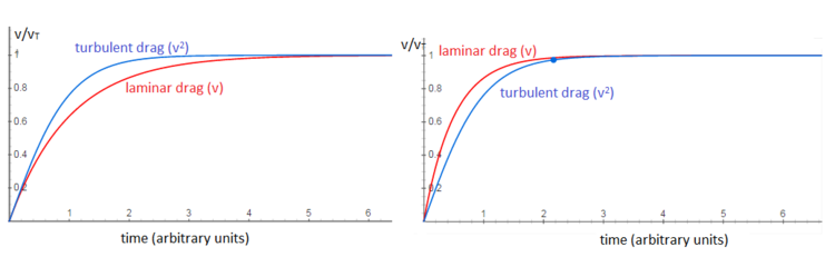 An object falling through viscous medium accelerates quickly towards its terminal speed, approaching gradually as the speed gets nearer to the terminal speed. Whether the object experiences turbulent or laminar drag changes the characteristic shape of the graph with turbulent flow resulting in a constant acceleration for a larger fraction of its accelerating time.