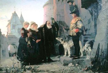 لوحة من القرن التاسع عشر لرجل مسن يجلب بناته الثلاثة لسيد الاقطاعيةالذي يمتلك حق السيد.