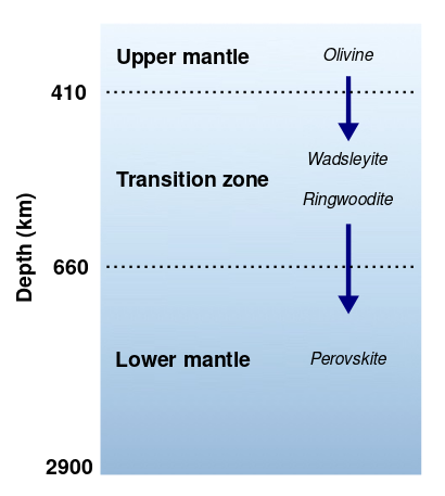 - المنطقة الانتقالية (حوالي 410-660 كم)، والتي يكون فيها الوادسلايت (≈ 410-520 كم) والرينگوودايت (≈ 525-660 كم) مستقراً.