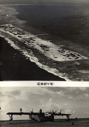 The Imperial Japanese Navy constructed a seaplane base on Ebeye in the early 1940s. Following the Battle of Kwajalein from 31 January to 3 February 1944, Ebeye was occupied by US forces. On 7 March the 107th Naval Construction Battalion was sent to Ebeye to redevelop the seaplane base. The Seabees repaired the existing 1،600-في-30-قدم (487.7 في 9.1 m) pier, adding a 50-في-240-قدم (15 في 73 m) ell extension, and also repaired a 250-قدم (76 m) Japanese H-shaped pier. The Seabees assembled a pontoon wharf and pontoon barges for transporting damaged carrier aircraft to repair units ashore. Further installations on Ebeye consisted of housing in floored tents and Quonset huts, a 150-bed dispensary, four magazines, 24،000 أقدام مربعة (2،200 m2) of covered storage, and a 4،000-US-barrel (480،000 L; 130،000 US gal; 100،000 imp gal) aviation-gasoline tank farm.[8]
