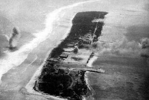 Ebeye island being shelled on 30 January 1944, prior to the Battle of Kwajalein later that year