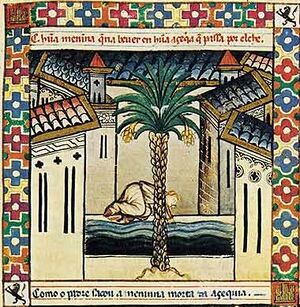 Miniature of the Cantiga #133 accounting for an alleged miracle that took place in Elche (13th century), entailing, together with Cantiga, #126 the first graphic representation of a palm tree in Elche[3]