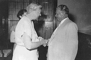 Eleanor Roosevelt in private showed a revulsion against rich Jews in 1918, telling her mother-in-law the "Jew party [was] appalling.... I never wish to hear money, jewels or sables mentioned again."[82][83] When she became co-owner of the Todhunter school in New York City, a limited number of Jews were admitted. Most students were upper-class Protestants, and Roosevelt said that the spirit of the school "would be different if we had too large a proportion of Jewish children." She said the problem is not just quantity but quality, since Jews were "very unlike ourselves" and had not yet become American enough. Her anti-Semitism gradually declined, especially as her friendship with Bernard Baruch grew.[84] After World War II she became a staunch champion of Israel, which she admired for its commitment to New Deal values.[85][86]