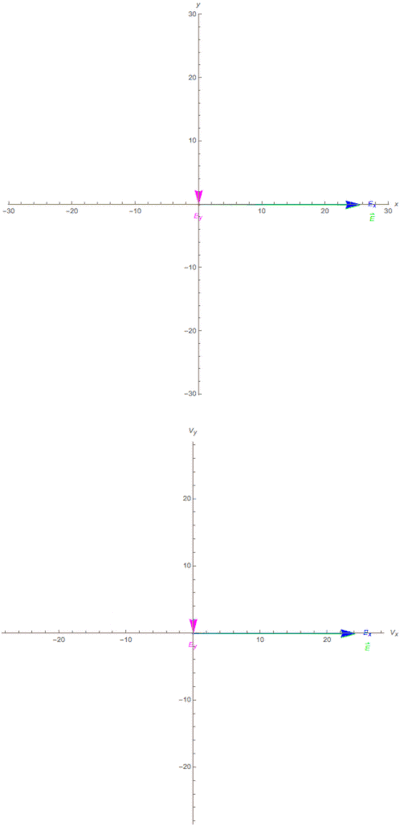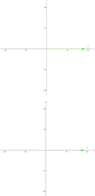 Example of cyclotron resonance between a charged particle and circularly polarized electric field (shown in green). The position vs. time (top panel) is shown as a red trace and the velocity vs. time (bottom panel) is shown as a blue trace. The background magnetic field is directed out towards the observer. Note that the circularly polarized example below assumes there is no Lorentz force due to the wave magnetic field acting on the charged particle. This is equivalent to saying that the charged particle's velocity orthogonal to the wave magnetic field is zero.