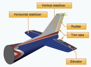 • a trim tab on the rear of the elevators or rudder which act to change the aerodynamic load on the surface. Usually controlled by a cockpit wheel or crank.[5][7]