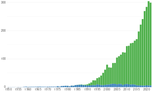 Capture (blue) and aquaculture (green) production of European seabass (Dicentrarchus labrax) in thousand tonnes from 1950 to 2022, as reported by the FAO[10]