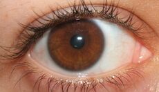 Hazel eyes are due to a combination of Rayleigh scattering and a moderate amount of melanin in the iris' anterior border layer.[4][38] Hazel eyes often appear to shift in color from a brown to a green. Although hazel mostly consists of brown and green, the dominant color in the eye can either be brown/gold or green. This is how many people mistake hazel eyes to be amber and vice versa.[71][72][73][74][75][76][77] This can sometimes produce a multicolored iris, i.e., an eye that is light brown/amber near the pupil and charcoal or dark green on the outer part of the iris (or vice versa) when observed in sunlight.