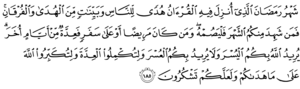 | ذكرت آيات أحكام الصيام ضمن سورة البقرة في قول الله تعالى: ﴿يَا أَيُّهَا الَّذِينَ ءامَنُواْ كُتِبَ عَلَيْكُمُ الصِّيَامُ كَمَا كُتِبَ عَلَىٰ الَّذِينَ مِن قَبْلِكُمْ لَعَلَّكُمْ تَتَّقُونَ قالب:MultiReplace أَيَّامًا مَّعْدُودَ ٰتٍ ۚ فَمَن كَانَ مِنكُم مَّرِيضًا أَوْ عَلَىٰ سَفَرٍ فَعِدَّةٌ مِّنْ أَيَّامٍ أُخَرَ ۚ وَعَلَى الَّذِينَ يُطِيقُونَهُ فِدْيَةٌ طَعَامُ مِسْكِينٍ ۖ فَمَن تَطَوَّعَ خَيْرًا فَهُوَ خَيْرٌ لَّهُ ۚ وَأَن تَصُومُوا خَيْرٌ لَّكُمْ ۖ إِن كُنتُمْ تَعْلَمُونَ قالب:MultiReplace شَهْرُ رَمَضَانَ الَّذِي أُنزِلَ فِيهِ الْقُرْآنُ هُدًى لِّلنَّاسِ وَبَيِّنََـٰتٍ مِّنَ الْهُدَىٰ وَالْفُرْقَانِ ۚ فَمَن شَهِدَ مِنكُمُ الشَّهْرَ فَلْيَصُمْهُ ۖ وَمَن كَانَ مَرِيضًا أَوْ عَلَىٰ سَفَرٍ فَعِدَّةٌ مِّنْ أَيَّامٍ أُخَرَ ۗ يُرِيدُ اللَّهُ بِكُمُ الْيُسْرَ وَلَا يُرِيدُ بِكُمُ الْعُسْرَ وَلِتُكْمِلُوا الْعِدَّةَ وَلِتُكَبِّرُوا اللَّهَ عَلَىٰ مَا هَدَ ٰكُمْ وَلَعَلَّكُمْ تَشْكُرُونَ قالب:MultiReplace وَإِذَا سَأَلَكَ عِبَادِي عَنِّي فَإِنِّي قَرِيبٌۖ أُجِيبُ دَعۡوَةَ ٱلدَّاعِ إِذَا دَعَانِۖ فَلۡيَسۡتَجِيبُواْ لِي وَلۡيُؤۡمِنُواْ بِي لَعَلَّهُمۡ يَرۡشُدُونَقالب:MultiReplace أُحِلَّ لَكُمْ لَيْلَةَ الصِّيَامِ الرَّفَثُ إِلَى نِسَائِكُمْ هُنَّ لِبَاسٌ لَكُمْ وَأَنْتُمْ لِبَاسٌ لَهُنَّ عَلِمَ اللَّهُ أَنَّكُمْ كُنْتُمْ تَخْتَانُونَ أَنْفُسَكُمْ فَتَابَ عَلَيْكُمْ وَعَفَا عَنْكُمْ فَالۡـَٰٔنَ بَـٰشِرُوهُنَّ وَابْتَغُوا مَا كَتَبَ اللَّهُ لَكُمْ وَكُلُوا وَاشْرَبُوا حَتَّى يَتَبَيَّنَ لَكُمُ الْخَيْطُ الْأَبْيَضُ مِنَ الْخَيْطِ الْأَسْوَدِ مِنَ الْفَجْرِ ثُمَّ أَتِمُّوا الصِّيَامَ إِلَى اللَّيْلِ وَلَا تُبَـٰشِرُوهُنَّ وَأَنْتُمْ عَـٰكِفُونَ فِي الْمَسَاجِدِ تِلْكَ حُدُودُ اللَّهِ فَلَا تَقْرَبُوهَا كَذَلِكَ يُبَيِّنُ اللَّهُ ءَايَاتِهِ لِلنَّاسِ لَعَلَّهُمْ يَتَّقُونَ قالب:MultiReplace﴾ —سورة البقرة، آية: (183 و184 و185 و186 و187) |