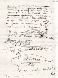 In 1912–14, while living with his aunt "Anica" and cousins,[35] Pessoa took part in "semi-spiritualist sessions" that were carried out at home, but he was considered a "delaying element" by the other members of the sessions. Pessoa's interest in spiritualism was truly awakened in the second half of 1915, while translating theosophist books. This was further deepened in the end of March 1916, when he suddenly started having experiences where he believed he became a medium, having experimented with automatic writing.[36] On June 24, 1916, Pessoa wrote an impressive letter to his aunt and godmother,[37] then living in Switzerland with her daughter and son-in-law, in which he describes this "mystery case" that surprised him.[36]