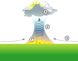 مخطط العاصفة النارية: (1) حريق، (2) تيار صاعد (3) رياح عاصفة قوية، (A) سحابة ركامية حرارية.