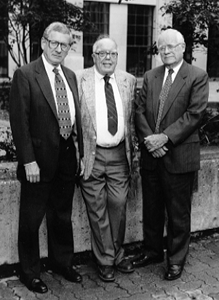 في جامعة كيس وسترن رزرڤ: من اليمين ألفرد گيلمان، الحاصل على جائزة نوبل في الطب أو الفسيولوجيا لعام 1994. وإلى اليسار: فردريك روبنز، الحاصل على جائزة نوبل في الطب أو الفسيولوجيا لعام 1954 والذي كان العميد الأسبق في فترة دراسة گيلمان، وهو الأستاذ الفخري بالكلية. وفي الوسط جاك كوگي عميد كلية الطب بالجامعة، والذي قام بقبول گيلمان طالباً في الكلية. الصورة مأخوذة في 1995.