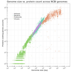 Genome size compared to number of genes. Log-log plot of the total number of annotated proteins in genomes submitted to GenBank as a function of genome size. Based on data from NCBI genome reports.