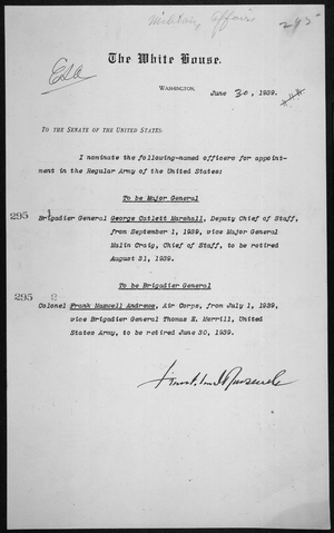 In July 1938, Marshall was assigned to the War Plans Division in Washington, D.C., and subsequently reassigned as Deputy Chief of Staff. In that capacity, then-Brigadier General Marshall attended a White House conference at which President Franklin D. Roosevelt proposed a plan to expand the United States Army Air Corps by 15,000 aircraft per year in preparation for World War II. With all other attendees voicing support, Marshall was the only one to disagree, pointing out the lack of consideration for logistical support or training. Marshall also spoke in favor of a large ground army although Roosevelt had said a large air force would be a greater deterrent to enemies, pointing out that the United States Army did not yet have a single division at full operational strength.[47] Despite others' belief then that Marshall had ended his career, his willingness to express disagreement resulted in Roosevelt nominating Marshall to be the Army Chief of Staff.