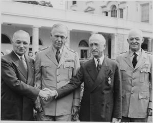 Throughout his retirement, Marshall served as chairman of the American Battle Monuments Commission.[116] He oversaw the construction of fourteen cemeteries in eight countries following World War II to memorialize those killed or missing in battle.[117] In the early 1950s, Marshall argued for the speedy construction and funding of cemeteries despite budget and staff cuts for the Korean War. Marshall wrote to General Joseph McNarney in March 1951 saying, "I am naturally hesitant to become personally involved in individual personnel problems, but in this case, am deeply concerned about the overall moral factor if our foreign national cemeteries are not adequately maintained...."[117] Marshall's efforts to secure building and maintenance staff for the cemeteries were successful, doubling the number of military officers assigned to the work.[117] On 13 September 1952, Marshall attended the dedication ceremony of Suresnes American Cemetery in France.[117][118]