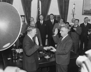 After retiring, Marshall largely withdrew from public life.[119] A notable exception was in June 1953, when he accepted President Eisenhower's appointment to head the American delegation to the coronation of Queen Elizabeth II.[120] The delegation included Earl Warren and Omar Bradley, and according to Bradley, as Marshall walked up the aisle of Westminster Abbey to take his seat before the ceremony, the congregation rose to its feet as a gesture of respect.[119] Marshall looked behind him to see who the arriving dignitary was, then realized the congregation had stood for him.[119] Marshall was also invited to the post-ceremony banquet at Buckingham Palace, and was the only non-royal seated at Queen Elizabeth's table.[119]