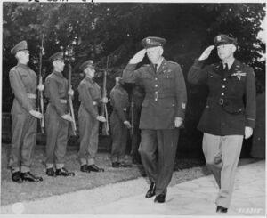 When rumors circulated that Marshall would become the Supreme Commander of Operation Overlord, many critics viewed the potential transfer as a demotion, since he would leave his position as Chief of Staff of the Army and lose his seat on the Combined Chiefs of Staff.[74] While Marshall enjoyed considerable success in working with Congress and Roosevelt, he refused to lobby for the position. Roosevelt selected Eisenhower, in large part because he did not want to do without Marshall in the Chief of Staff position. He told Marshall, "I didn't feel I could sleep at ease if you were out of Washington."[75]