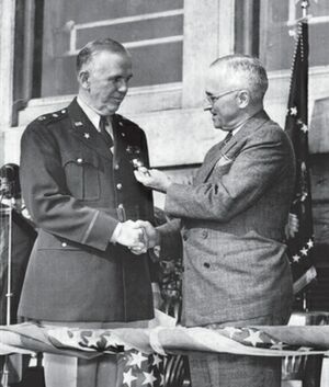 After the war, Marshall became an aide-de-camp to Army chief of staff John J. Pershing. Marshall later served on the Army staff, was the executive officer of the 15th Infantry Regiment in China and was an instructor at the Army War College. In 1927, he became assistant commandant of the Army's Infantry School, where he modernized command and staff processes, which proved to be of major benefit during World War II.[6] In 1932 and 1933, he commanded the 8th Infantry Regiment and Fort Screven, Georgia. Marshall commanded 5th Brigade, 3rd Infantry Division and Vancouver Barracks from 1936 to 1938; he received promotion to brigadier general. During this command, Marshall was also responsible for 35 Civilian Conservation Corps (CCC) camps in Oregon and Southern Washington. In July 1938, Marshall was assigned to the War Plans Division on the War Department staff; he later became the Army's deputy chief of staff. When Chief of Staff Malin Craig retired in 1939, Marshall assumed the role of Chief of Staff in an acting capacity before his appointment to the position, which he held until the war's end in 1945.[7]