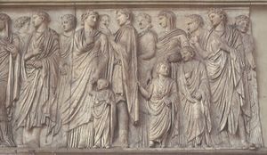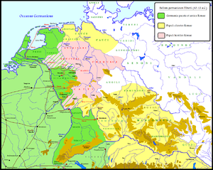 His praenomen is unknown, but he was probably named Nero Claudius Drusus after his father (conventionally called "Drusus"),[3] or possibly Tiberius Claudius Nero after his uncle Tiberius.[4] In 9 BC, the agnomen Germanicus was added to his full name when it was posthumously awarded to his father in honor of his victories in Germania.[5] Though the name was inherited by his siblings too, the title seems at first to have been used exclusively by him.[6] By AD 4 he was adopted as Tiberius' son and heir. As a result, Germanicus was adopted out of the Claudii and into the Julii. In accordance with Roman naming conventions, he adopted the name "Julius Caesar" while retaining his agnomen, becoming Germanicus Julius Caesar.[7][note 1] Upon Germanicus' adoption into the Julii, his brother Claudius became the sole legal representative of his father, and chose to assume the title Germanicus as well.[8][9]