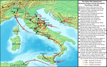 The war followed the Roman reconquest of the diocese of Africa from the Vandals. Historians commonly divide the war into two phases. The first phase lasts from 535 to the fall of the Ostrogothic capital Ravenna in 540, and the apparent reconquest of Italy by the Byzantines. The second phase from 540/541 to 553 featured a Gothic revival under Totila, which was suppressed only after a long struggle by the Roman general Narses, who also repelled an invasion in 554 by the Franks and Alamanni.