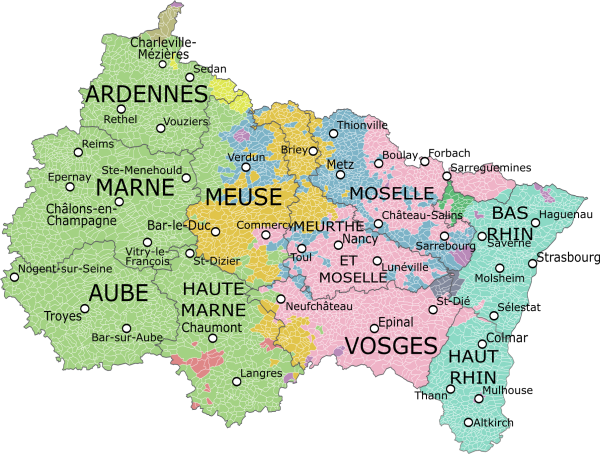 ██ شامبانيا ██ لورين (منطقة) ██ ألزاس ██ Barrois ██ Three Bishoprics ██ Sarrewerden ██ Salm-Salm ██ بورغندي ██ أسقفية أمير لياج ██ دوقية لوكسمبورغ ██ small principalities