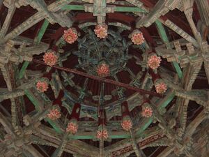 It is believed that the prayer hall was constructed during the Ming dynasty, although significant reconstructions occurred during the Qing era. This argument has been supported by the numerous wooden columns in the prayer hall as the use of wooden columns predates that of brick columns which were typical of Qing dynasty buildings. The prayer hall is a monumental timber building with a turquoise hip roof, painted dougong (wooden brackets), a six-pillared portico, and five doors. Contrary to most mosques in many Muslim-majority states, the prayer hall does not feature a dome-shaped ceiling but has a traditional Chinese, pointy ceiling covered with ceramic decorative tiles. Meanwhile, the prayer hall is decorated with images of plants and flowers, suggesting the decorative program still followed the Islamic tradition that forbids anthropomorphic imageries. The ceiling is raised upon a large stone platform lined with wooden balustrades. The expansive prayer hall consists of three conjoined buildings, set one behind the other. In the furthest part of the prayer hall stands the rear qibla wall, which has wooden carvings of floral and calligraphic designs.[6]