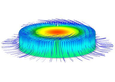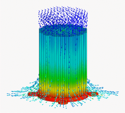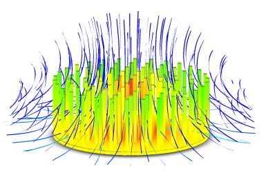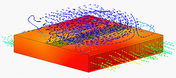 Pin fin heat sink with thermal profile and free convection flow trajectories predicted using a CFD analysis package |