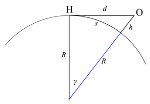 Graphs of distances to the true horizon on Earth for a given height h. s is along the surface of the Earth, d is the straight line distance, and ~d is the approximate straight line distance assuming h << the radius of the Earth, 6371 km. In the SVG image, hover over a graph to highlight it.