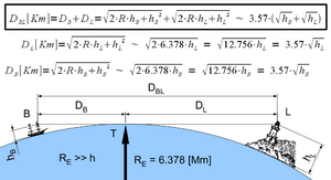 A much simpler approach, which produces essentially the same results as the first-order approximation described above, uses the geometrical model but uses a radius R′ = 7/6 RE. The distance to the horizon is then[2]
