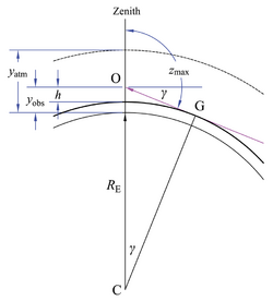 where h is the observer's height above the Earth, μ is the index of refraction of air at the observer's height, and μ0 is the index of refraction of air at Earth's surface.