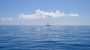 View of the ocean with a ship on the horizon (small dot to left of foreground ship)