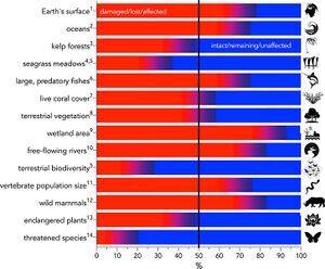 According to a 2018 study in Nature, 87% of the oceans and 77% of land (excluding Antarctica) have been altered by anthropogenic activity, and 23% of the planet's landmass remains as wilderness.[114]
