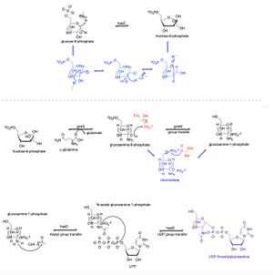 The path forward from fructose-6-P utilizes glmS (amidotransferase) to form glucosamine-6-P. Then, glmM (Mutase) reacts with this product to form glucosamine-1-P. hasD (acetyltransferase) converts this into n-acetylglucosamine-1-P, and finally, hasD (pyrophosphorylase) converts this product into UDP-n-acetylglucosamine.[50]