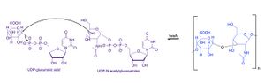 UDP-glucuronic acid and UDP-n-acetylglucosamine get bound together to form HA via hasA (HA synthase).[49]