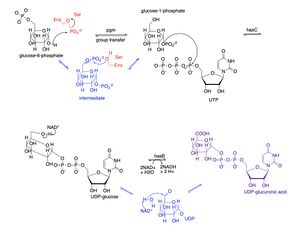 UDP-glucuronic acid is formed from hasC (UDP-glucose pyrophosphorylase) converting glucose-1-P into UDP-glucose, which then reacts with hasB (UDP-glucose dehydrogenase) to form UDP-glucuronic acid.[49]