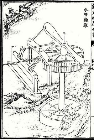 Water-powered trip hammers and bellows in China, during the Han dynasty (202 BC – 220 AD), were initially thought to be powered by water scoops.[15] However, some historians suggested that they were powered by waterwheels. This is since it was theorized that water scoops would not have had the motive force to operate their blast furnace bellows.[20] Many texts describe the Hun waterwheel; some of the earliest ones are the Jijiupian dictionary of 40 BC, Yang Xiong's text known as the Fangyan of 15 BC, as well as Xin Lun, written by Huan Tan about 20 AD.[21] It was also during this time that the engineer Du Shi (c. AD 31) applied the power of waterwheels to piston-bellows in forging cast iron.[21]
