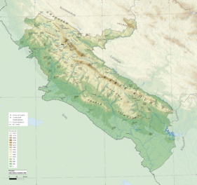 The most prominent mountain in Ilam province is Kabir Kouh, which is located in the eastern part of the province, stretching 160 km from near Pol-e Zal in the southeast to Mishkhas village near Ilam city in the northwest. The highest point in the province, Kan Seifi peak with 2،775 m (9،104 ft) above sea level, is part of Kabir Kouh range.[25][26][27]